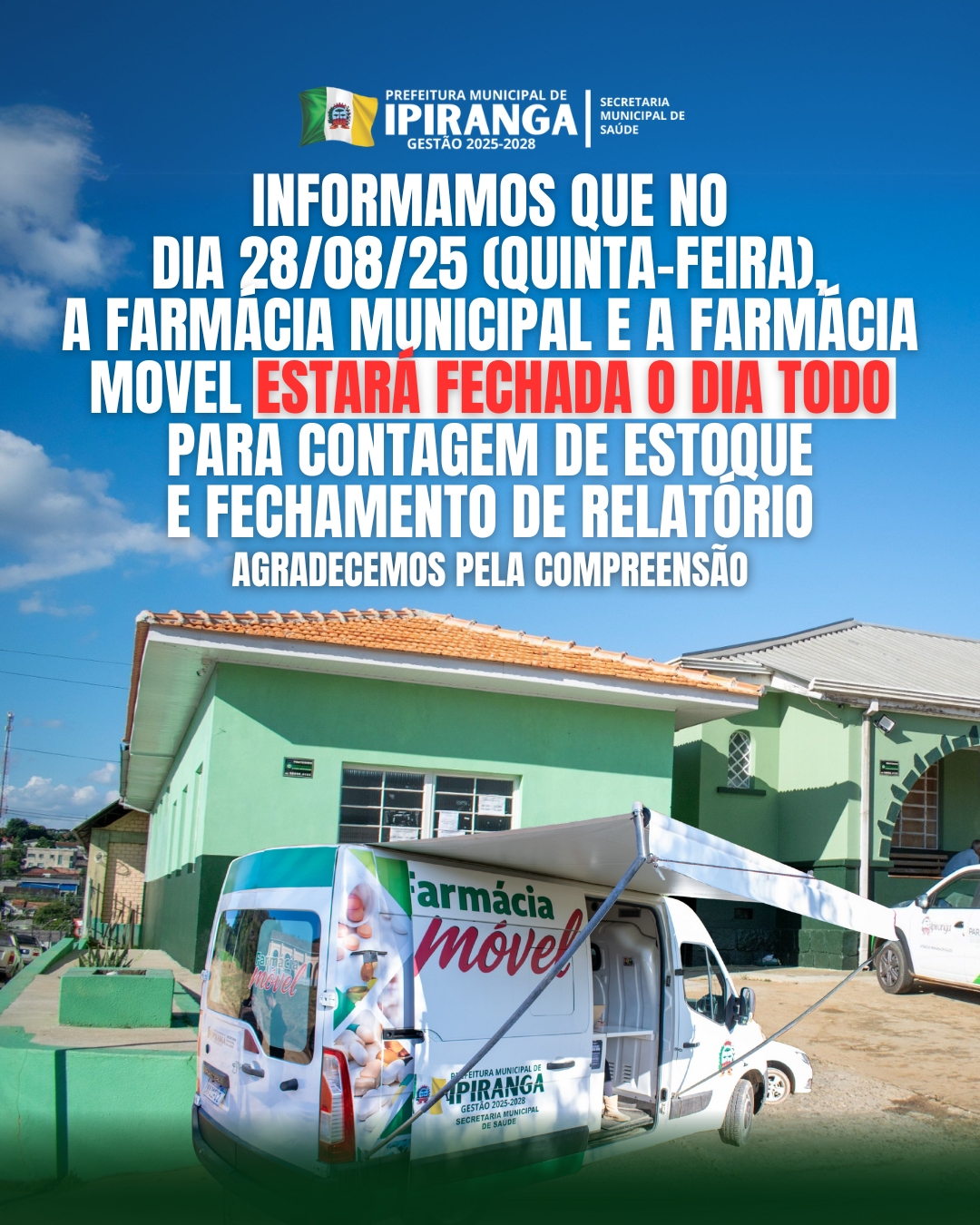 A Prefeitura Municipal informa que a Farmácia Municipal e a Farmácia Móvel estarão fechadas nesta quinta-feira, 28 de agosto, para a contagem de estoque e fechamento de relatórios.