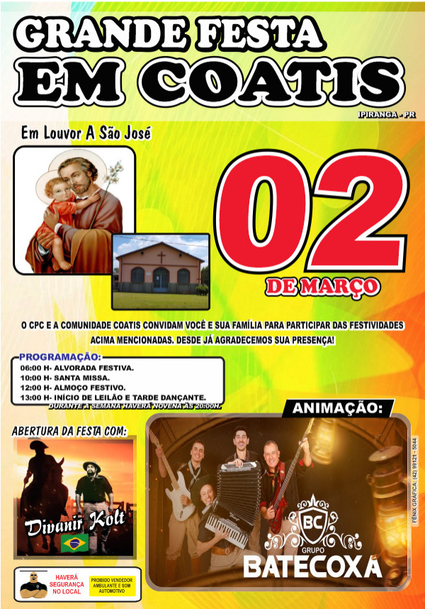 É, e quem não gosta ,então você não deixar de participar desse grande evento que vai acontecer na comunidade de Coatis, em louvor A São José, animação vai ficar por conta do Grupo Bate Coxa e abertura da festa vai ficar por conta do grande radialista e cantor Divonir Kolt, então não deixe de participar!!