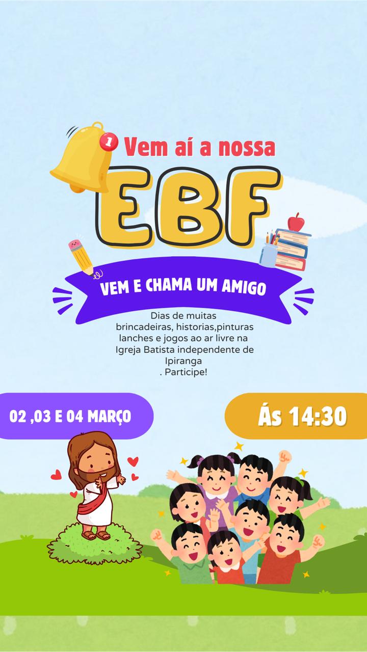 A Igreja Batista Independente de Ipiranga, realiza nos dias 02,03 e04 de março, muita diversão, dias de muitas brincadeiras, histórias, pinturas, lanches e jogos ao ar livre, o local vai ser na igreja Batista de Ipiranga, convide um amigo e venha participar desse eventos ,pra toda a criançadas da nossa comunidade, começa neste domingo 02 de março e vai até o dia 04 de março, sempre com horário de inicio previsto para as 14h30 com término as 17 horas, voltada diretamente para todas as crianças...
