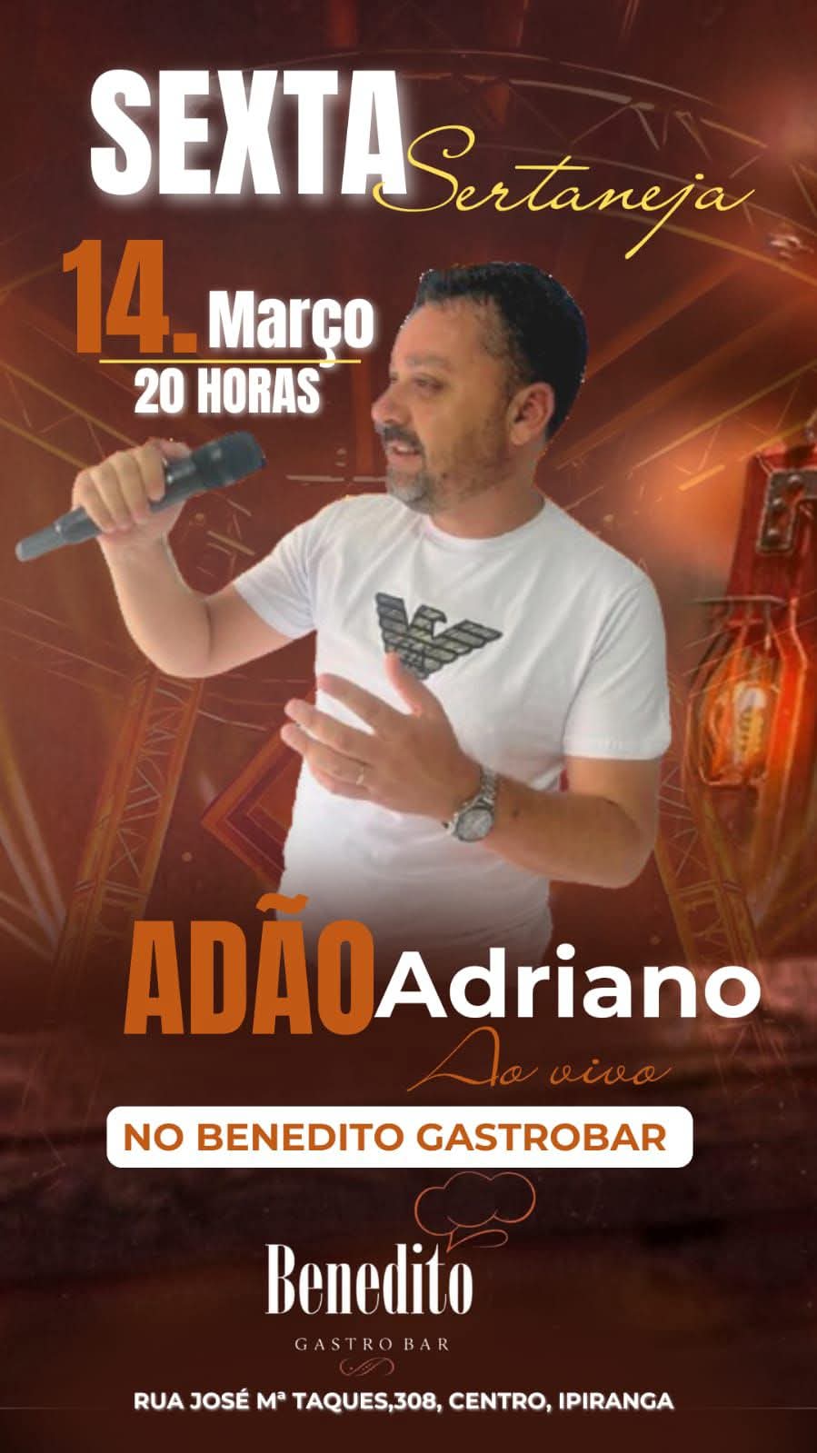 Nessa sexta feira dia 14 de março, tem musica ao vivo, musica boa no SEXTA SERTANEJA NO BENEDITO GASTROBAR, venha comer aquela porção gostosa, fazer aquele lanche saboroso e ainda desfrutar de uma boa musica sertaneja ao vivo, num ambiente gostoso e bem familiar com total segurança, e desta vez o cantor sertanejo Adão Adriano, vem se apresentar, e mostrar todo o seu repertório.