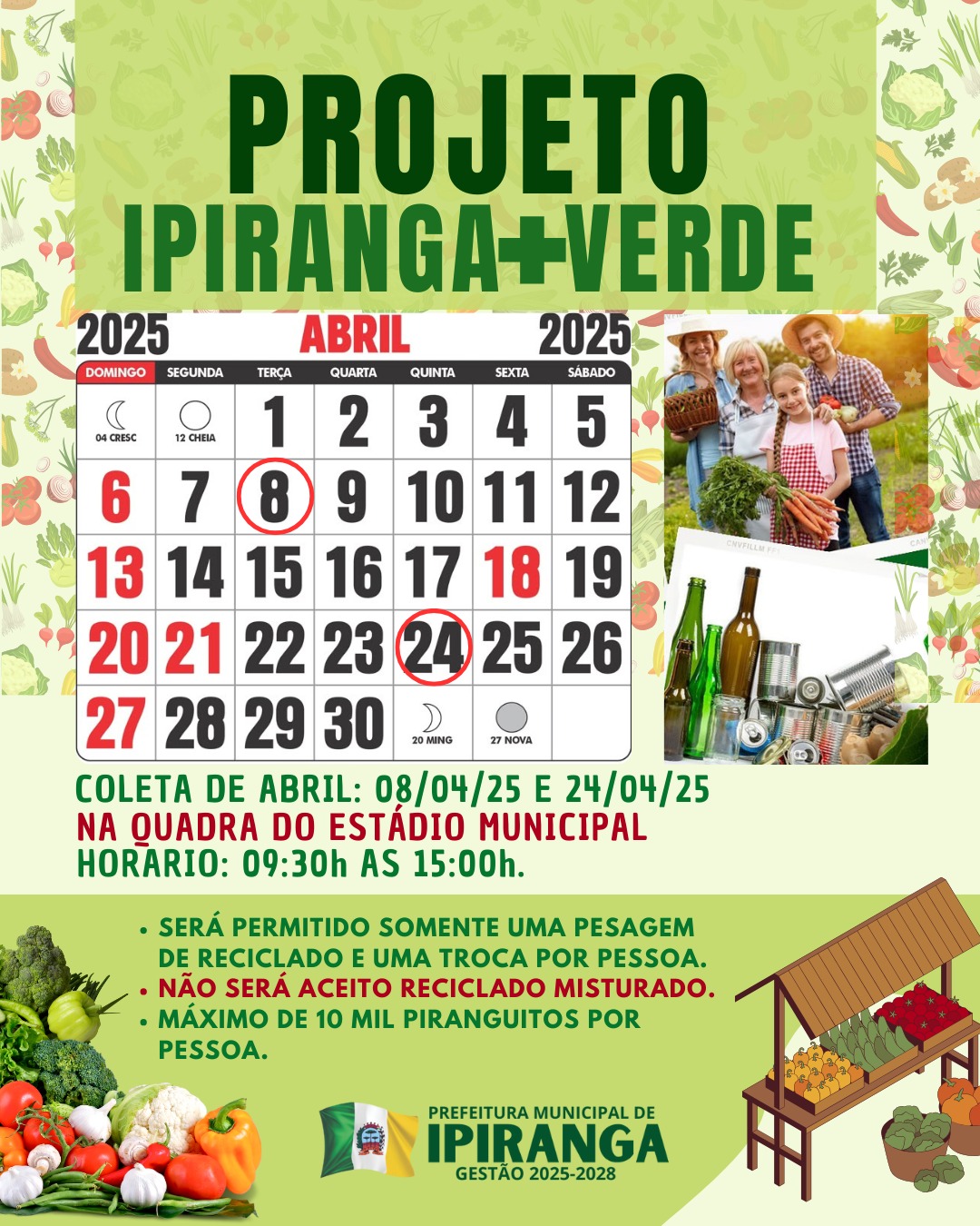 Projeto Ipiranga mais verde ,coleta de abril :08/04/25 na quadra do estado municipal horário : 9h30 ate as 15 horas