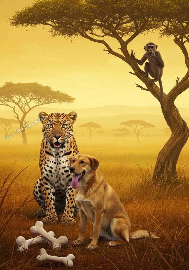 O cão, atento, viu os dois voltarem — a onça furiosa e o macaco montado em suas costas.