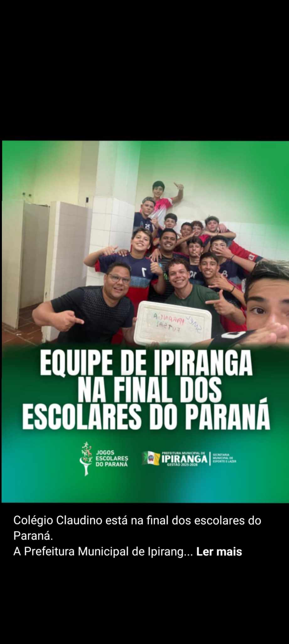 E, pois é, Ipiranga sendo celeiro de talentos, em todo os esporte Ipiranga sempre brilha, sempre que há investimentos e sempre da resultado, dessa vez representado pelo colégio dr Claudino dos Santos esta na final do futsal nos jogos escolares do Paraná...