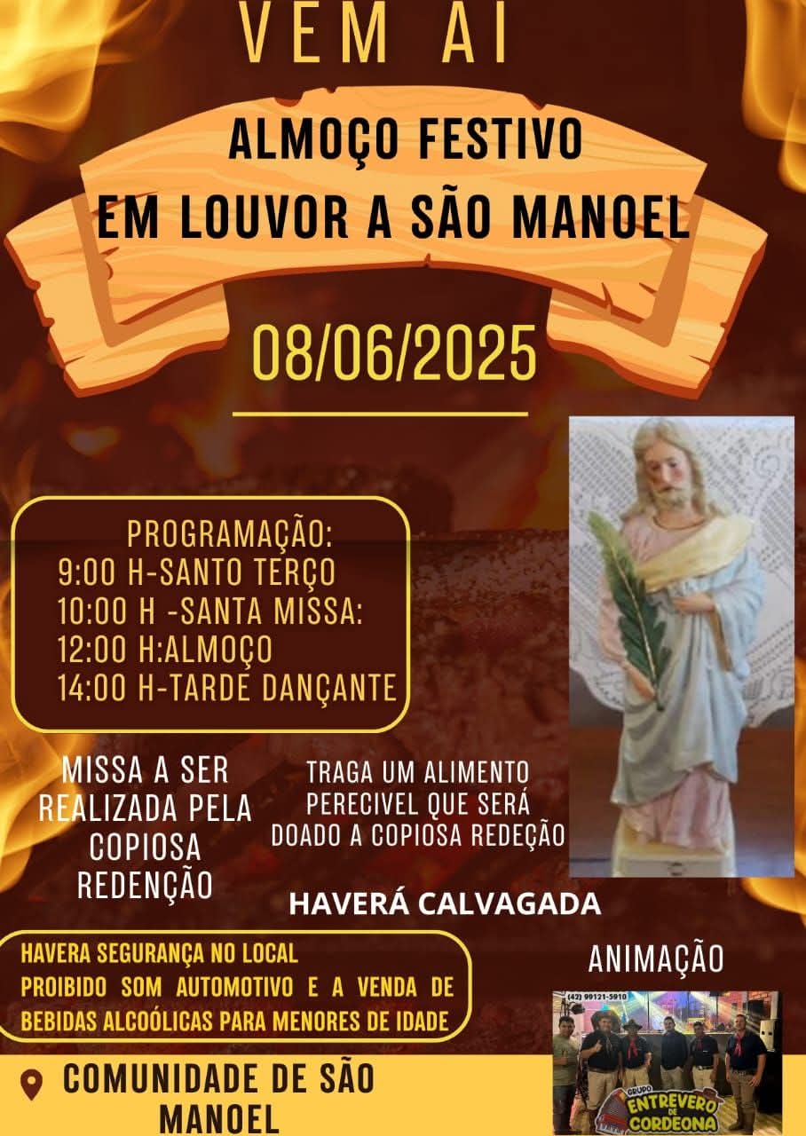 DOMINGO DIA 08 DE JUNHO GRANDE almoço festivo NA comunidade de São Manuel, confira a programação !!!