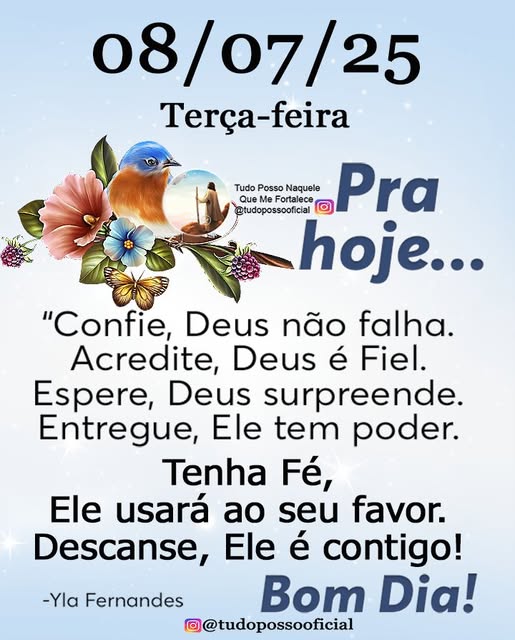 Bom dia, é terça-feira! Que você sinta a presença de Deus de maneira especial, renovando suas esperanças e enchendo seu coração de alegria. Que os desafios se transformem em oportunidades de crescimento e que sua semana seja abençoada e repleta de vitórias.