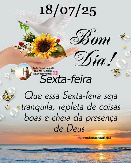 Sexta-feira chegou trazendo leveza; o final de semana desponta no horizonte como um sopro de paz. É hora de descansar a mente, renovar a alma e celebrar cada instante que a vida oferece com simplicidade, gratidão e esperança.