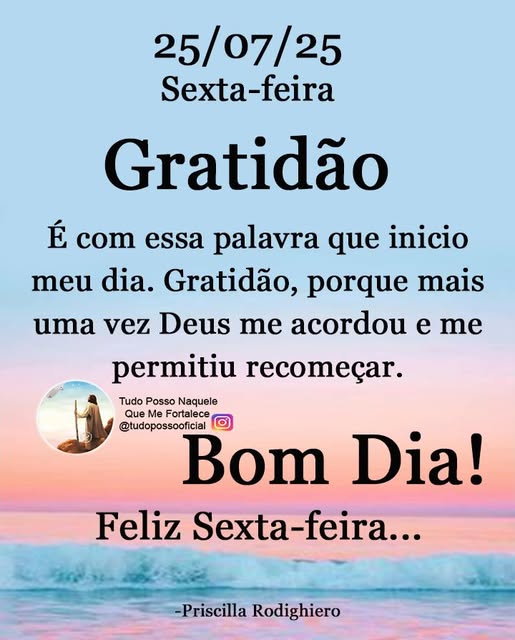 Sexta-feira chegou trazendo leveza; o final de semana desponta no horizonte como um sopro de paz. É hora de descansar a mente, renovar a alma e celebrar cada instante que a vida oferece com simplicidade, gratidão e esperança.