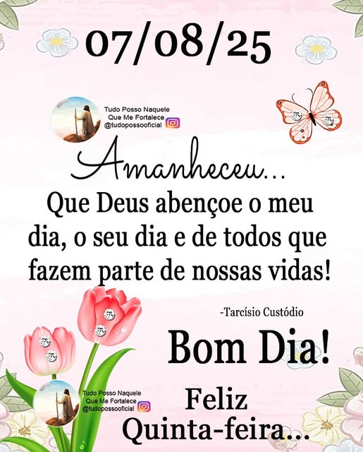 Bom dia, quinta-feira, dia de fé Que nossa quinta seja abençoada por Deus Que Ele nos dê saúde e paz E que o restante a gente corra atrás